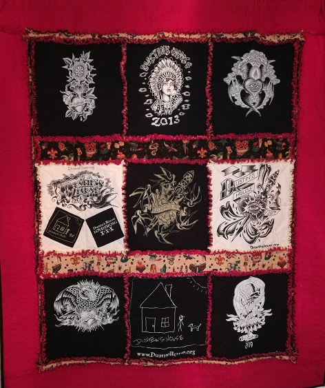 #lovestrong . We have a very special auction item this year- a quilt including the first nine Dustin's House t-shirts.